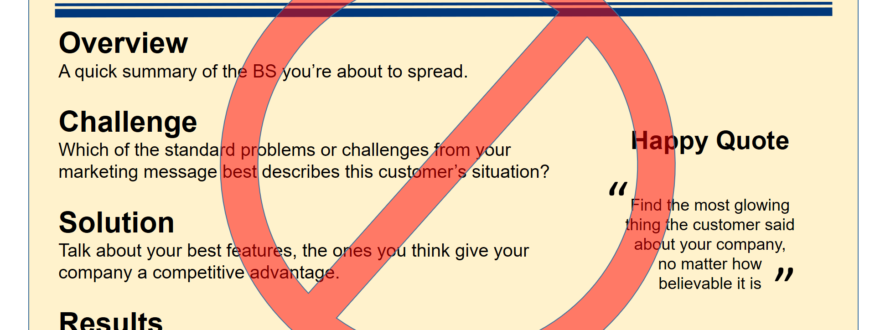 And don’t even get me started on the format. OK, I’m already started, so every case study in the world (prove me wrong, someone) follows the same format…It’s a 2-4 page PDF, following the template in the picture above: Background, Challenge, Solution, Results, and the obligatory “happy quote” in the sidebar.
